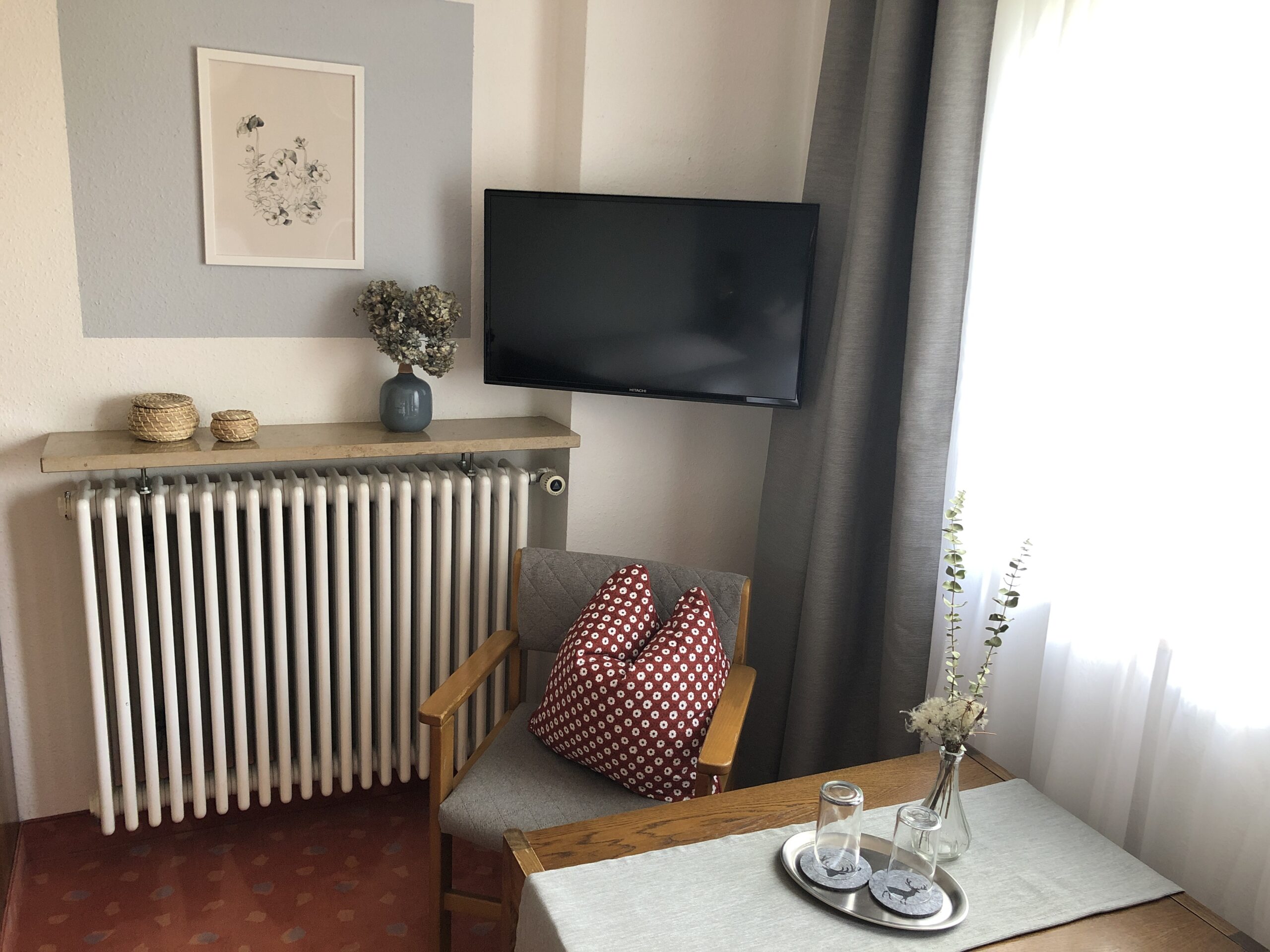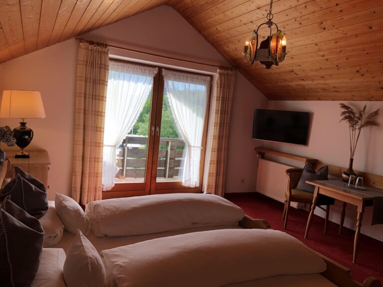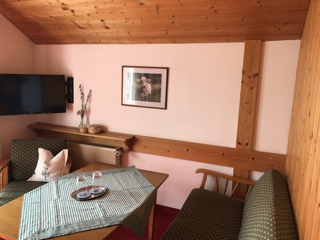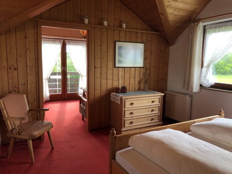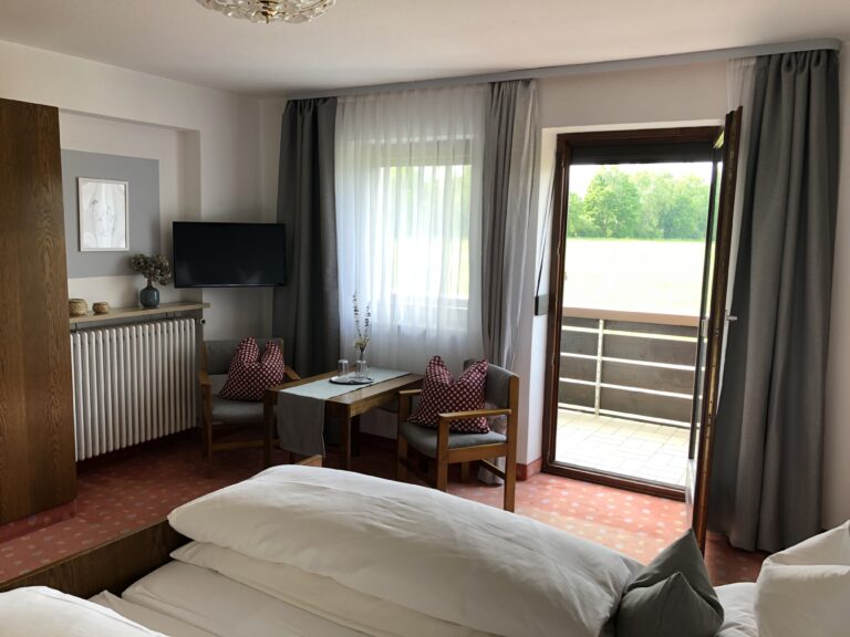 Das Zimmer „Wiesenglück“ besteht aus einem geräumigen Schlafzimmer und einem gemütlichen Fernsehzimmer. Der Balkon bietet einen wunderschönen Aus- und Weitblick auf Wiesen und Felder.