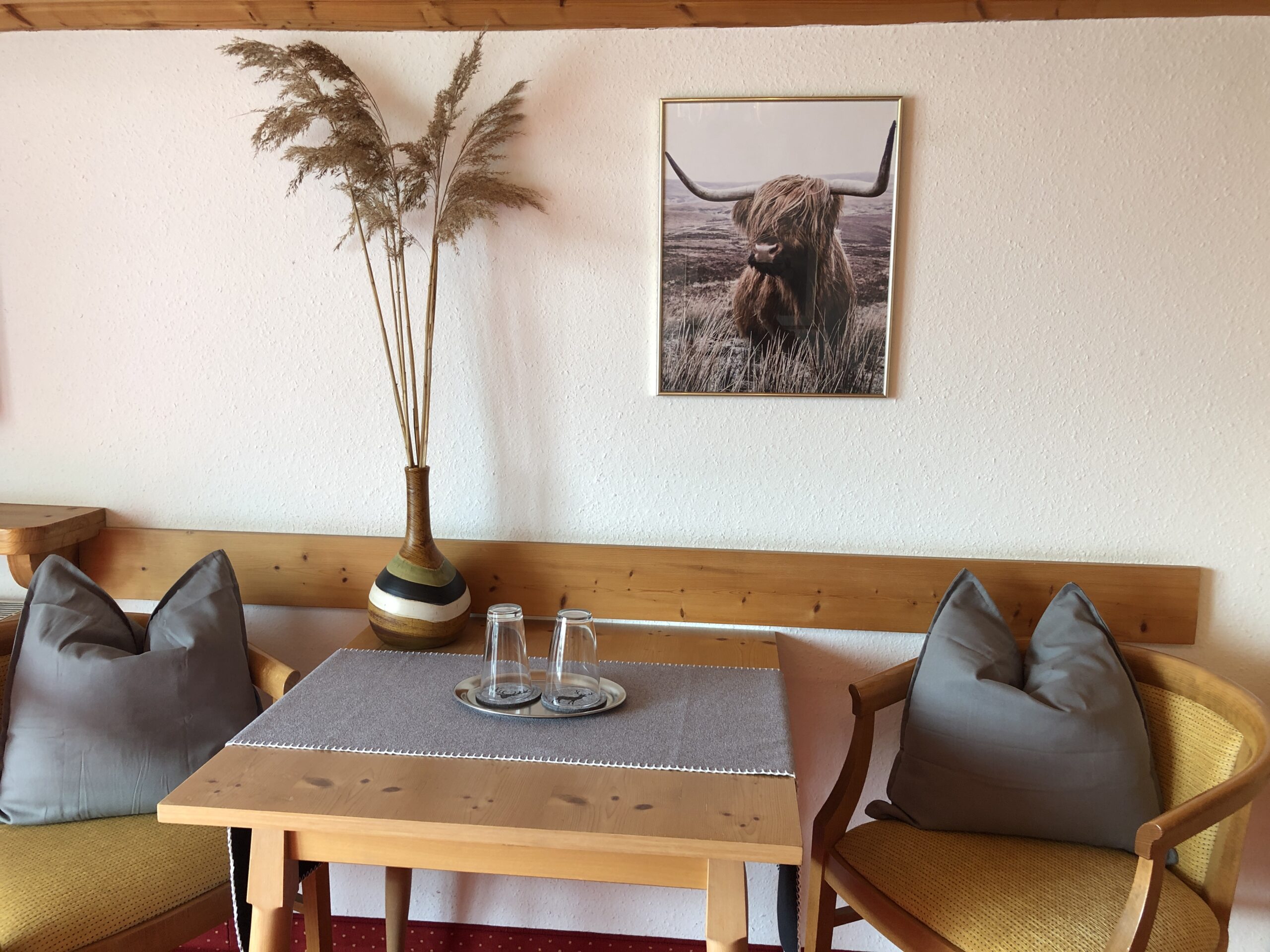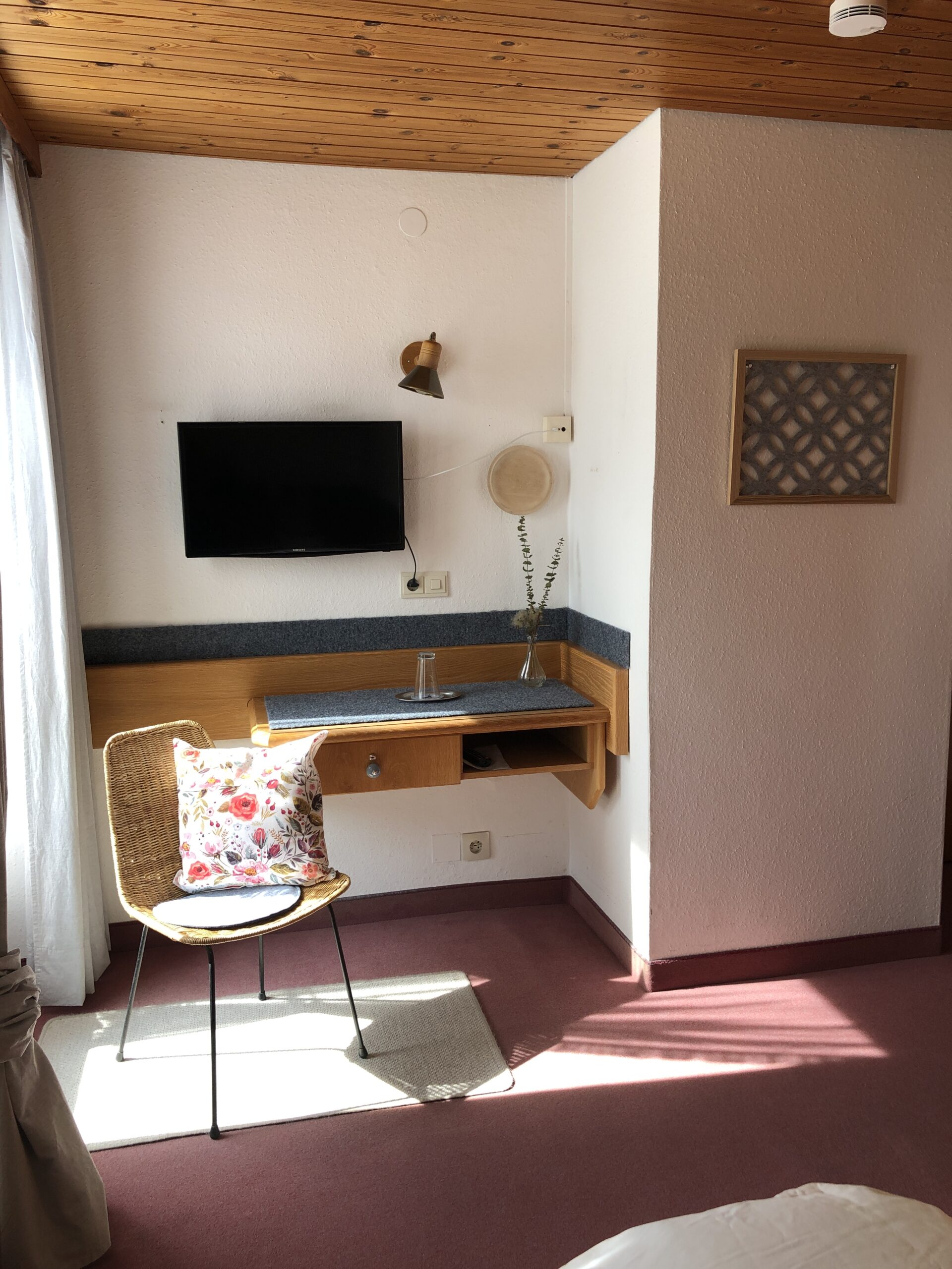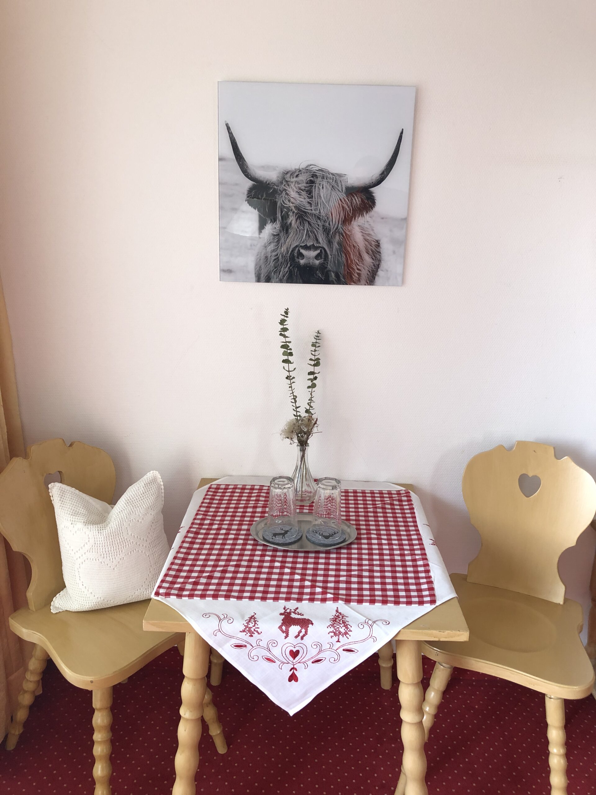 Das Zimmer „Wiesenglück“ besteht aus einem geräumigen Schlafzimmer und einem gemütlichen Fernsehzimmer. Der Balkon bietet einen wunderschönen Aus- und Weitblick auf Wiesen und Felder.